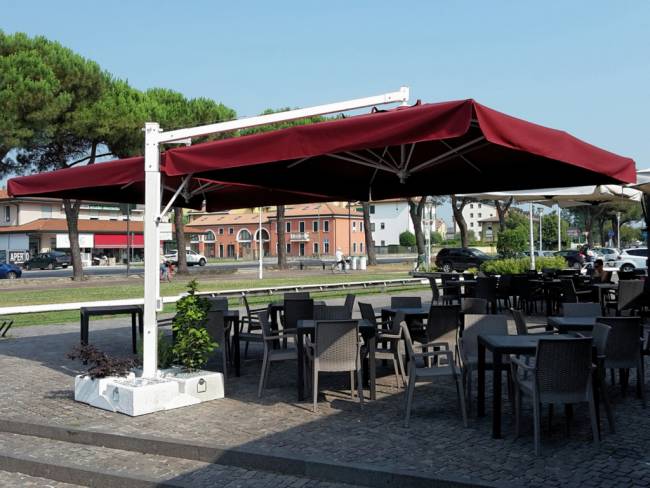 Alu Double Starwhite состоит из двух отдельных зонтов, закрепленных на одной центральной опоре. Модель - элегантный образец дизайна с особым вниманием к деталям и отделке. Двухкупольный зонт подходит для затенения больших пространств, при этом занимает минимум площади. Каркас и спицы выполнены из алюминия с усиленными стальными элементами и покрытием порошковой краской белого цвета, что позволяет использовать зонт в любых погодных условиям, в том числе в условиях с повышенной влажностью. Легко заменяемые прочные алюминиевые спицы с запатентованными пластиковыми наконечниками, которые увеличивают сопротивление и срок службы, упрощают техническое обслуживание и улучшают конструкцию. Специальное крепление к опоре (Wind Stop) для лучшей устойчивости в ветренную погоду и для обеспечения наклона зонта. Каждый купол выполнен из акрила 350 г/м² с пропиткой. Варианты цвета: слоновая кость (A1), терракота (T2), бордовый (T3), серо-коричневый (T6), белый (T7), серебристо-серый (T8), антрацит (T9), черный (S1). Цена на сайте указана для зонта с куполом в бордовом цвете (T3) с воланом. По запросу доступно выполнение купола из акрила Special Collection класса A и B (минимальный заказ 5 шт.). Технические характеристики зонта: высота общая 3250 мм; высота до кромки открытого зонта: 2350 мм; высота до кромки закрытого зонта: 550 мм; общая ширина 4300 мм (включая базу), общая длина 7000 мм; размер каждого купола 3500х3500 мм. Посмотреть технические характеристики. Посмотреть инструкцию по установке зонта. Таблица выбора утяжелительных баз для стабилизации зонта. В комплект поставки входит: Каркас с поворотным механизмом (360°). Два купола с воланом, механизм открытия-закрытия, вентиляционная заглушка (ветровой клапан). Система быстрой замены спиц "Easy Change". База для утяжелительных плит. Открыть инструкцию по эксплуатации уличных зонтов. Компания Scolaro создана 50 лет назад и была известна как ремесленное производство деревянных зонтиков. Традиционные позиции и современные знания позволили Scolaro выпускать широкий спектр зонтов, которые позволяют не только укрываться от солнца и дождя, но и являются прекрасным дополнением интерьера стильных заведений. Дизайн, новые технические решения и сочетание высококачественных материалов имеют решающее значение для технической эволюции зонтов Scolaro, процесс производства которых является полностью итальянским. Наша компания - официальный эксклюзивный дистрибьютор фабрики Scolaro Mario & Fabio srl. в России. На все зонты компании Scolaro предоставляется сервисное и гарантийное обслуживание. Для того, чтоб зонт прослужил долго, воспользуйтесь инструкциями по эксплуатации и хранению зонтов.